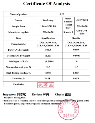 آنالیز شیمیایی گازهای مبرد توسط شرکت سازنده و همچنین آزمایشگاههای معتبر انجام میشود و با توجه به اطلاعات شرکت سازنده، گواهی تایید آنها صادر میشود. در آنالیز شیمیایی، مواردی نظیر درصد خلوص گاز، میزان رطوبت (یعنی میزان آب موجود در مبرد) و همچنین میزان اسیدی بودن مبرد اندازهگیری میشود. در صورت تمایل، کارشناسان شرکت میتوانند گواهی اصالت گاز را پیش از خرید برای شما ارسال کنند. در ادامه میتوانید نمونه برگه اطلاعات فنی گاز R22 برند آلفا را مشاهده کنید.